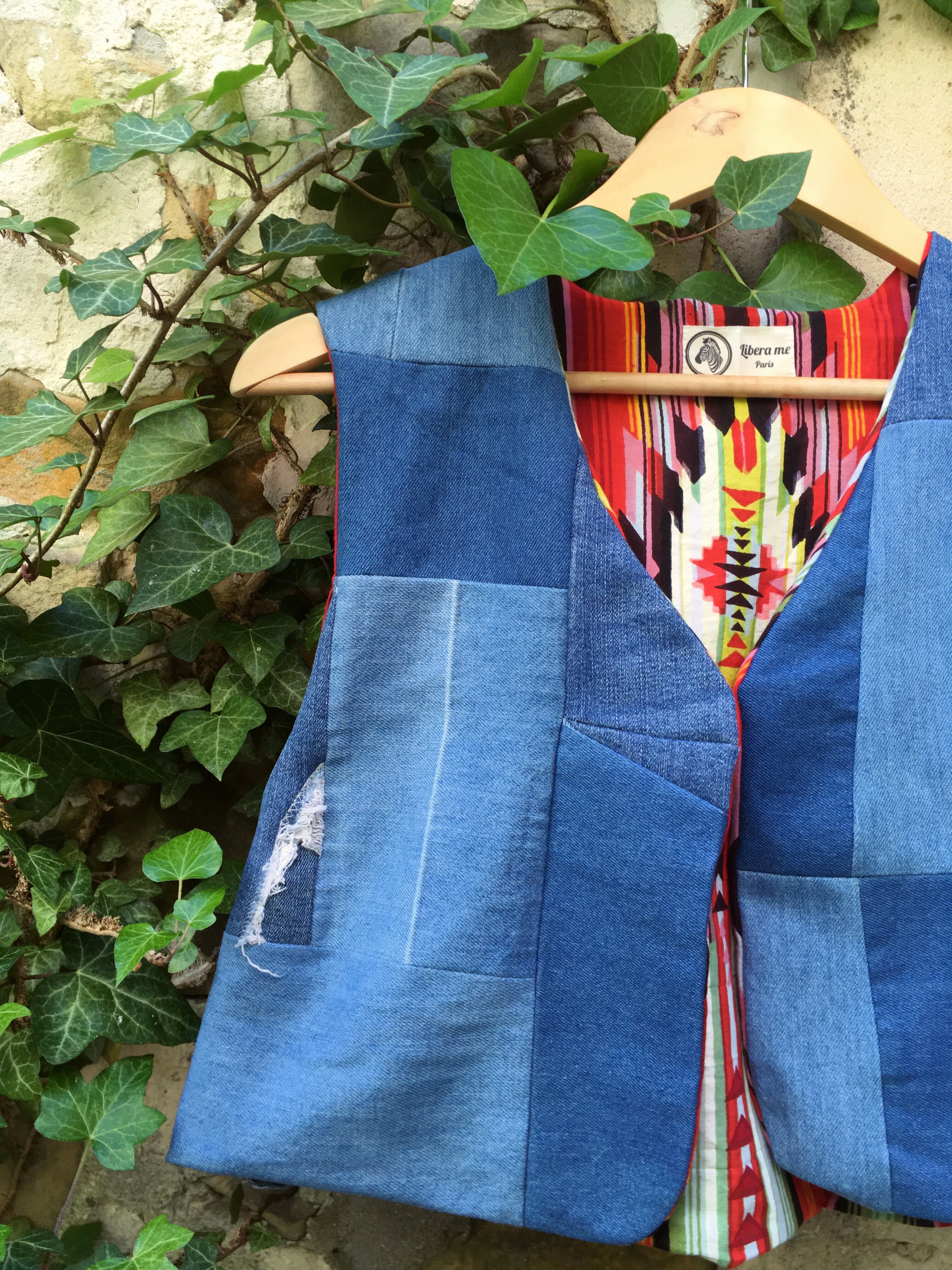 ヴィンテージパッチワーク デニム ベスト UPCYCLING フランス製 リバーシブルメキシカン生地