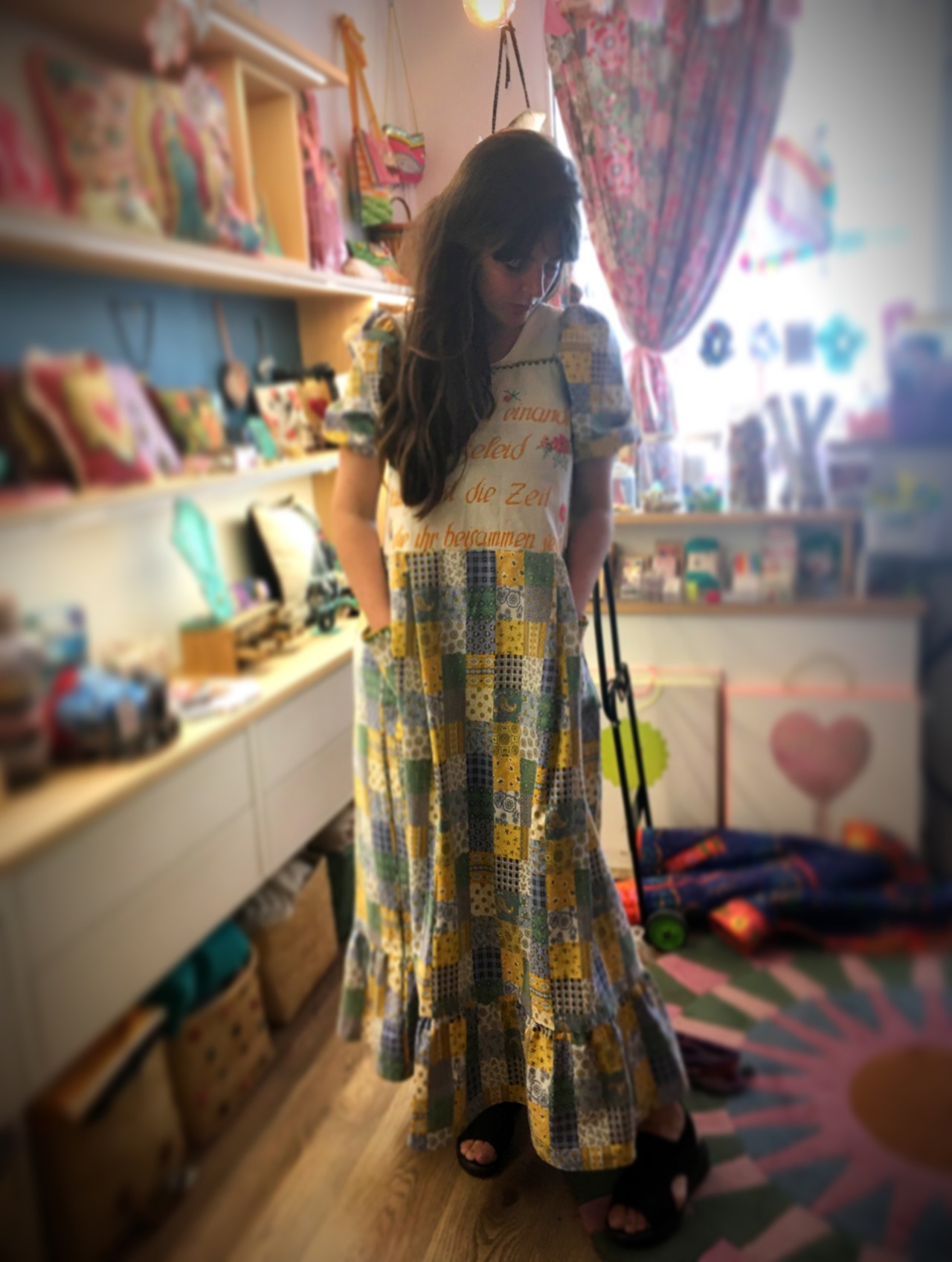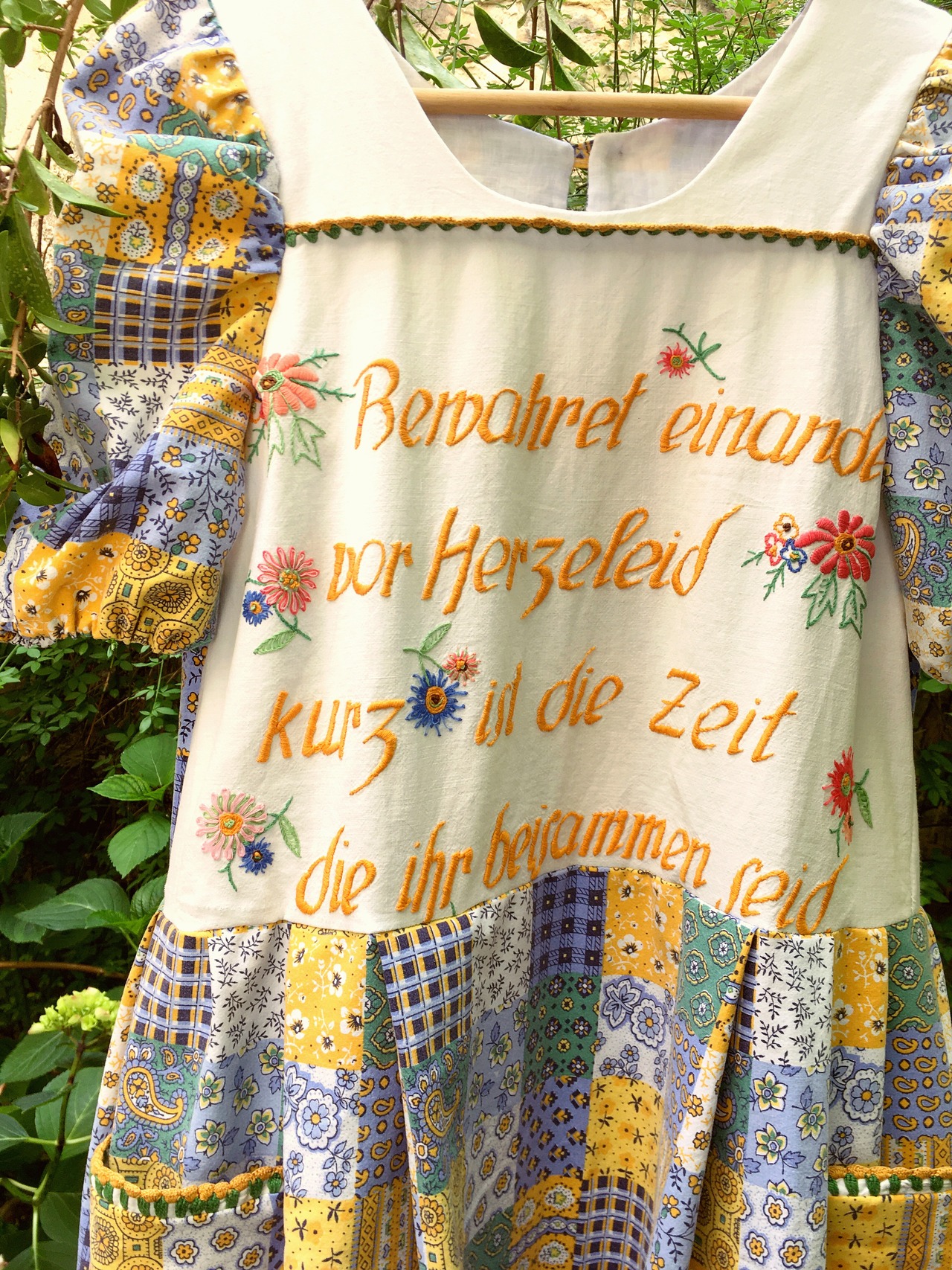 フランス製のテーブルクロスをアップサイクルしたこのワンピースは、独特なデザインが魅力で、素敵な気分を引き立ててくれます。ドイツ語の刺繡が施されており、特別な日のお出かけにぴったりなアイテムです。