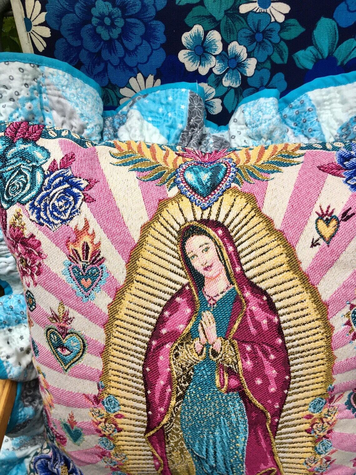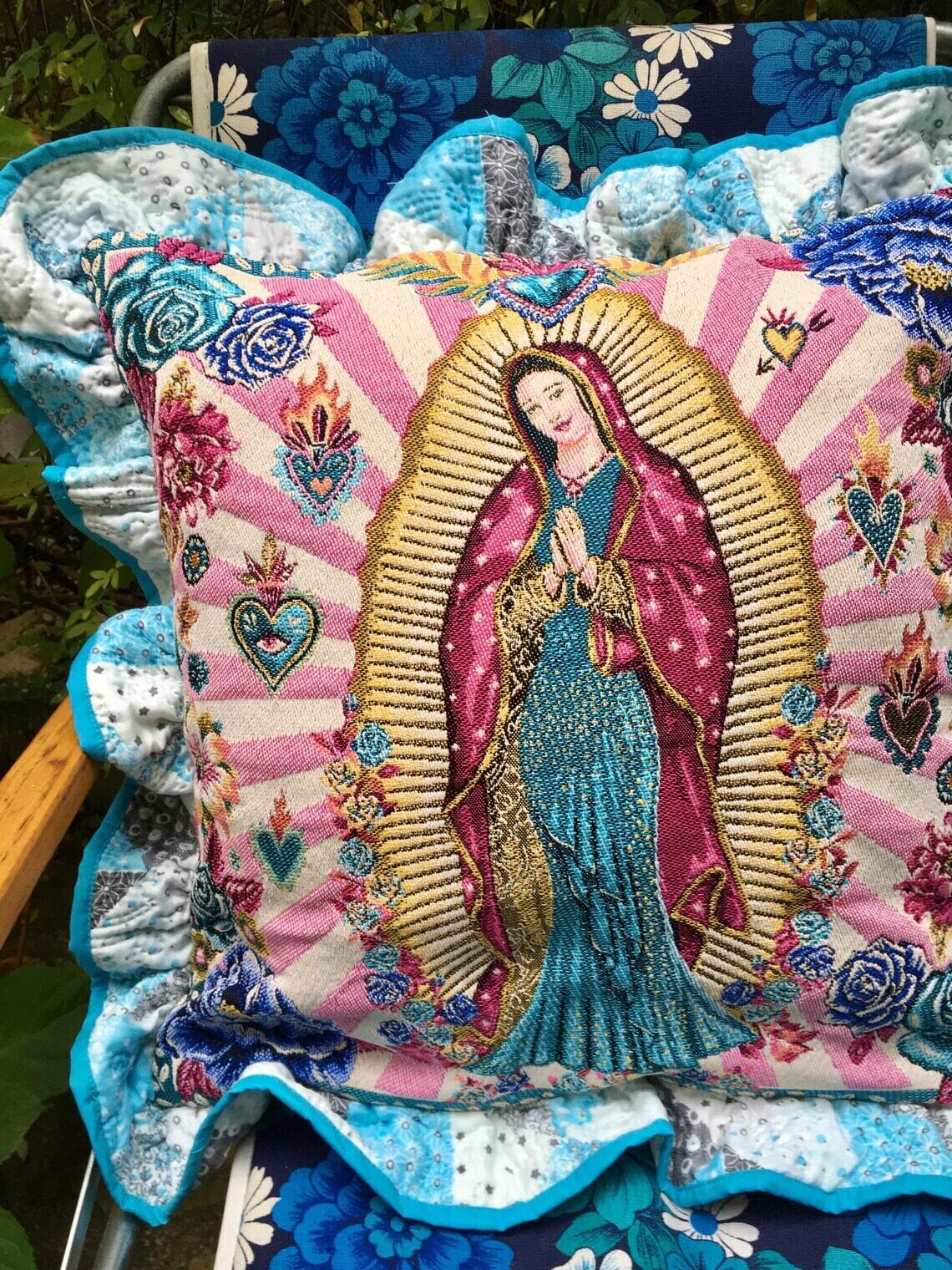 このフリルクッションカバーは、フランス製のマリア様ジャガード生地を使用しており、とても特別な一品です。色鮮やかなピンクのデザインが、お部屋に華やかさをプラスします!