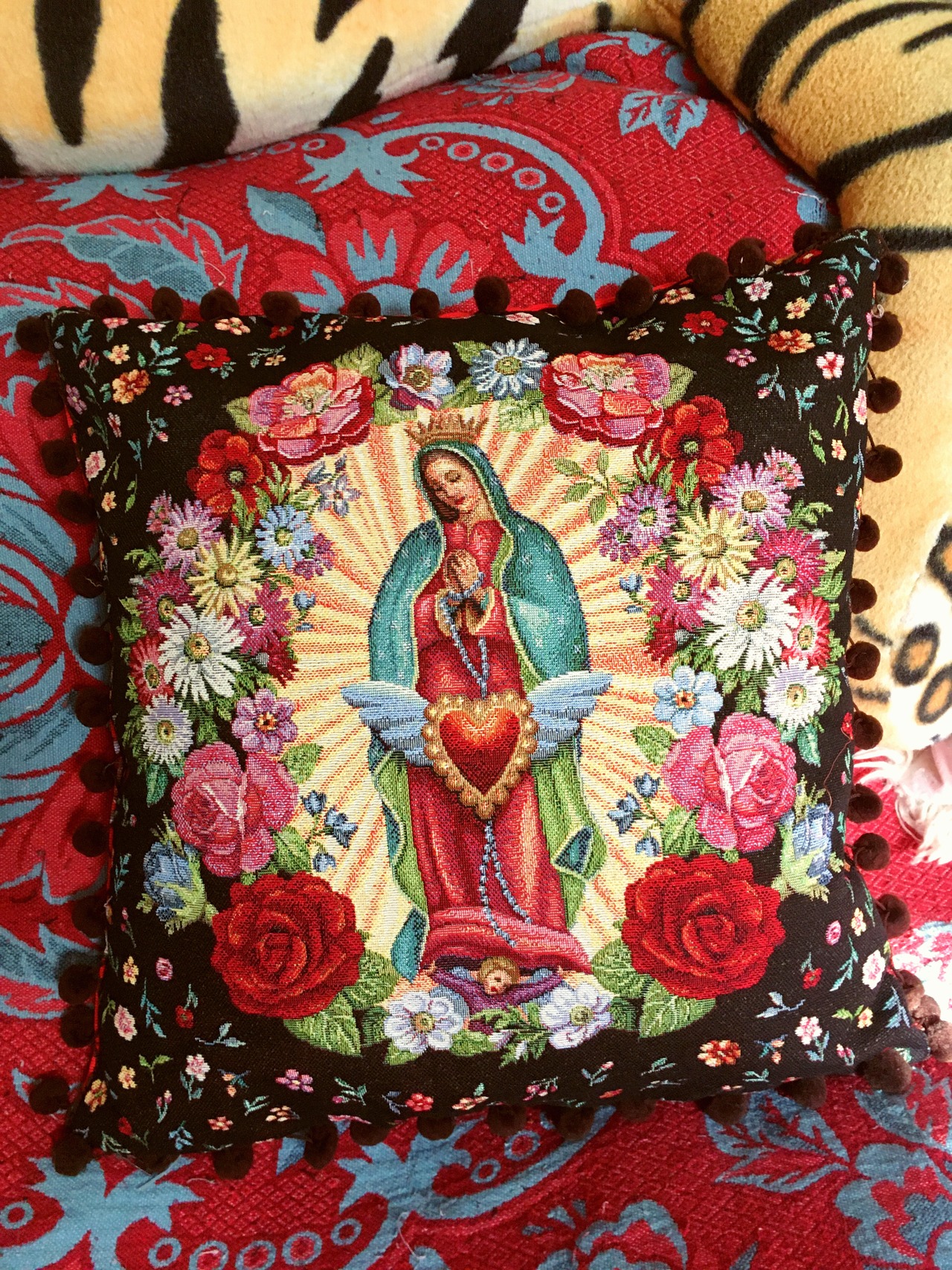 このマリア様ジャガード生地を使用したポンポンクッションカバーは、フランス製の特別なアイテムです。シックなブラックのデザインが、シンプルながらもお部屋に上品なアクセントを与えます!