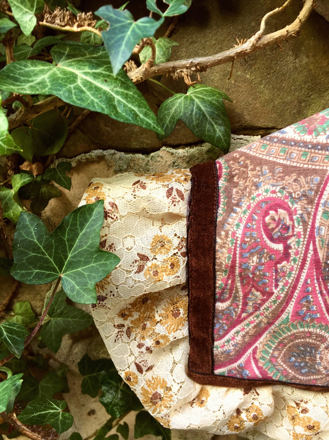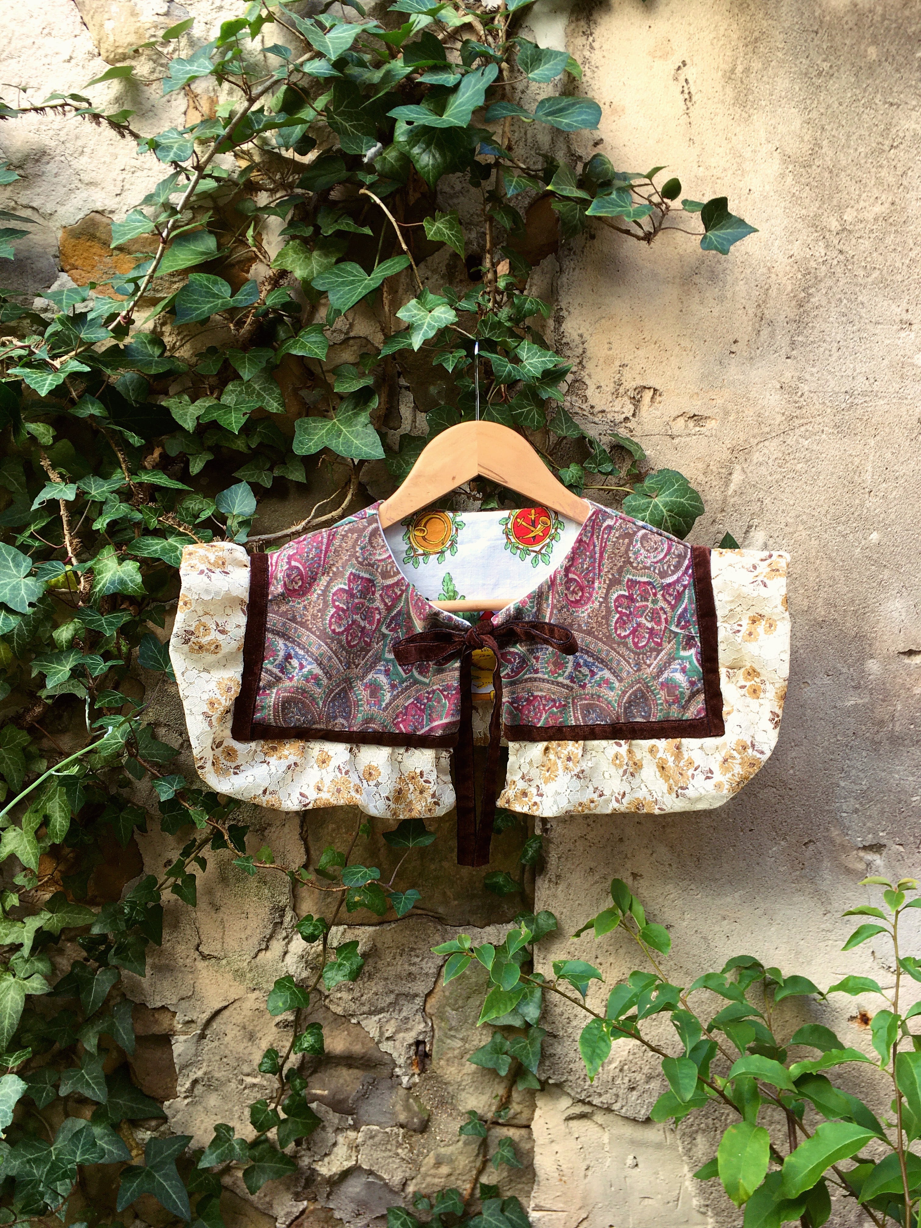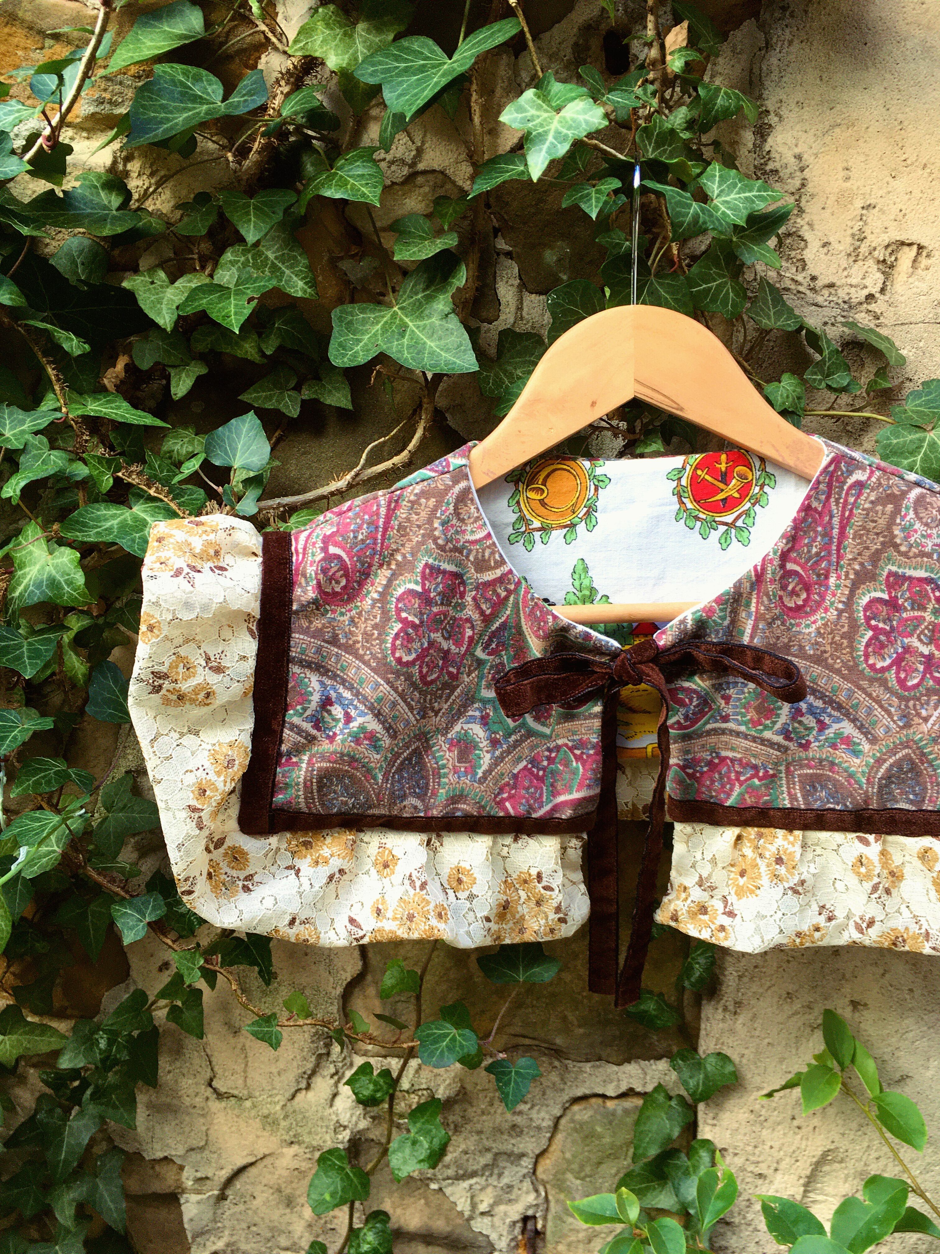 このつけ襟は、リバーシブルデザインになっており、その日の気分に合わせて簡単にスタイルチェンジが可能です。柔らかなアンティークレースと、デッドストック生地の組み合わせが、一層の深化をもたらします。