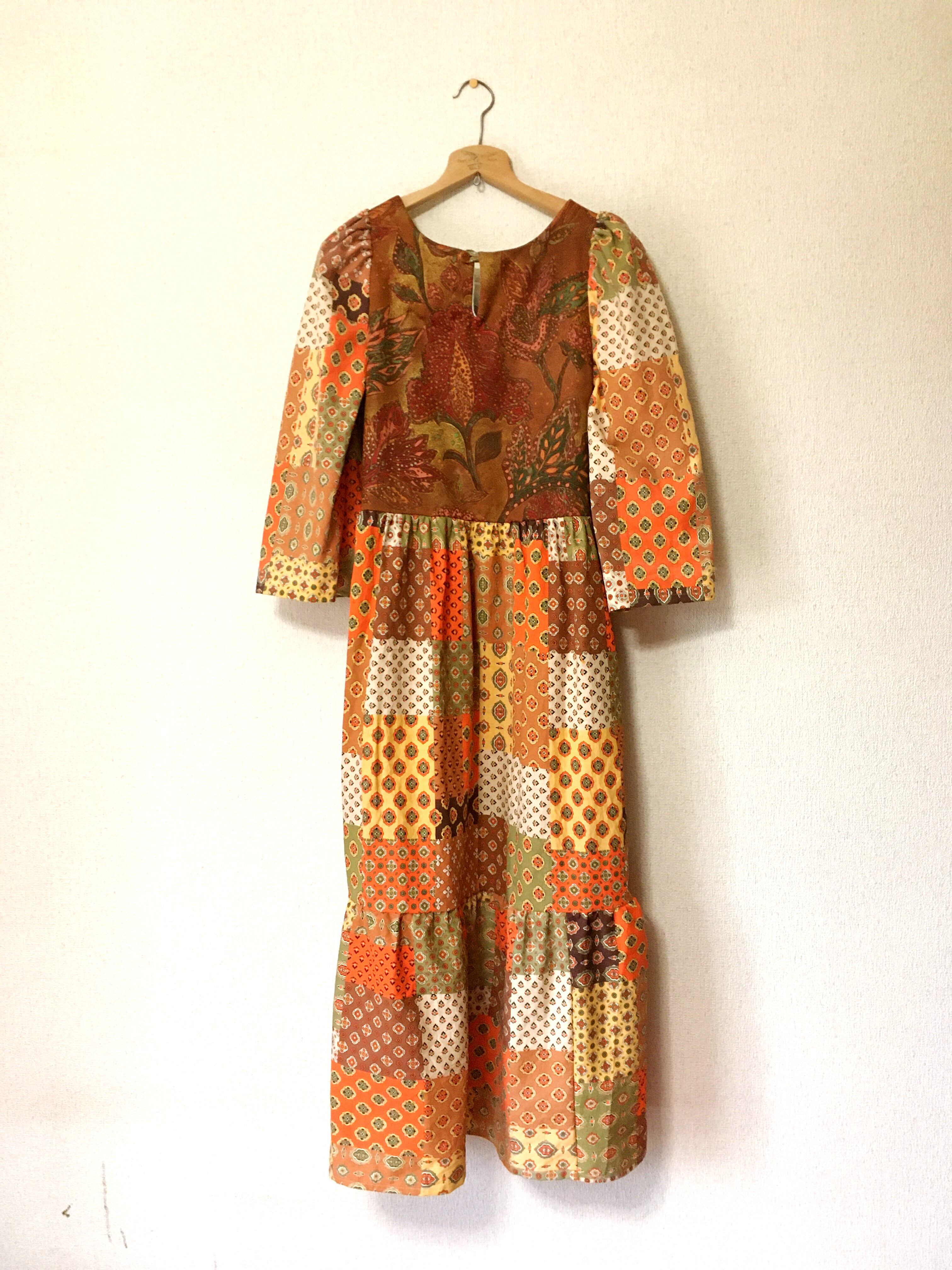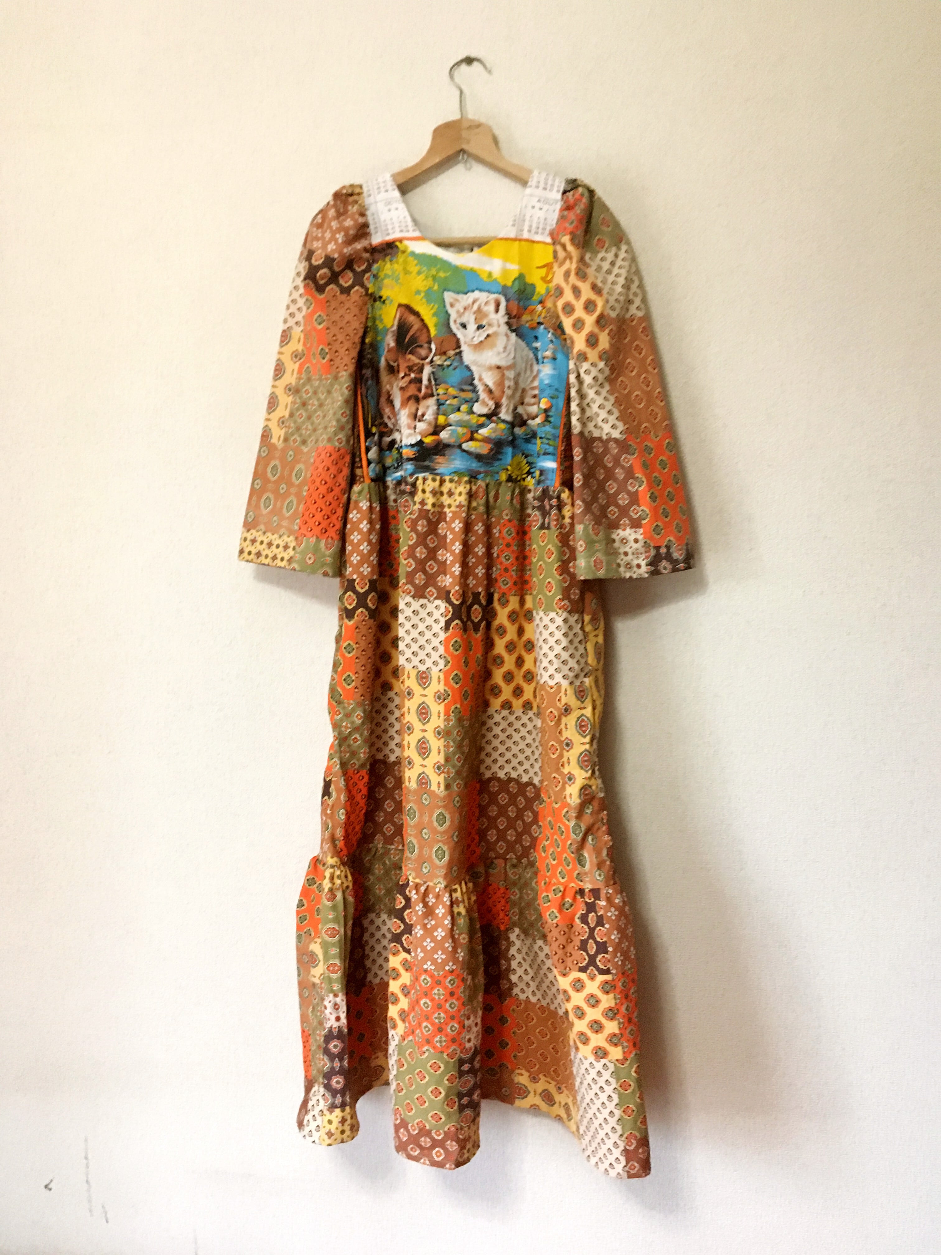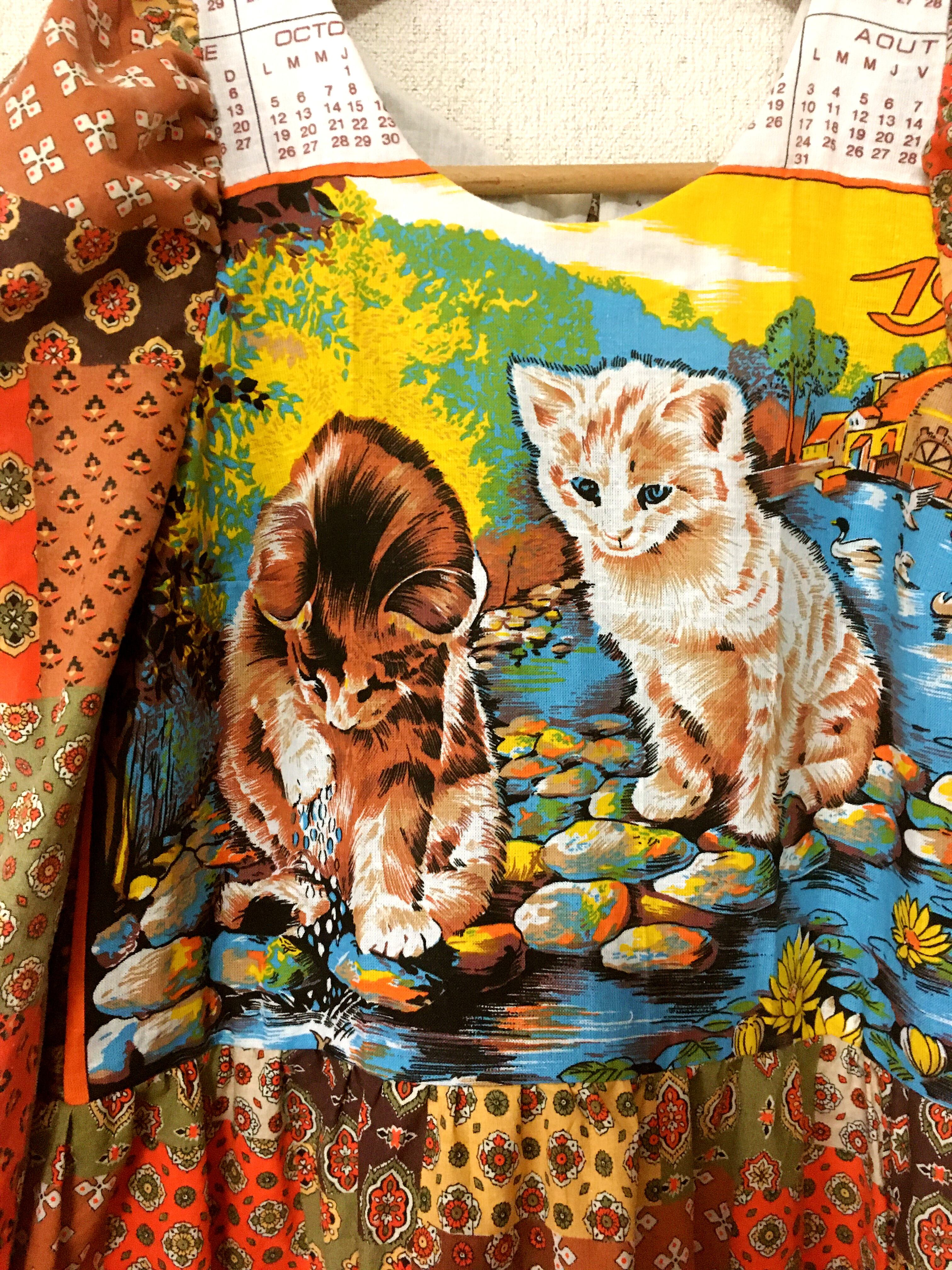 ヴィンテージパッチワーク風生地 upcycling ワンピース フランス製 ネコ柄キッチンタオル