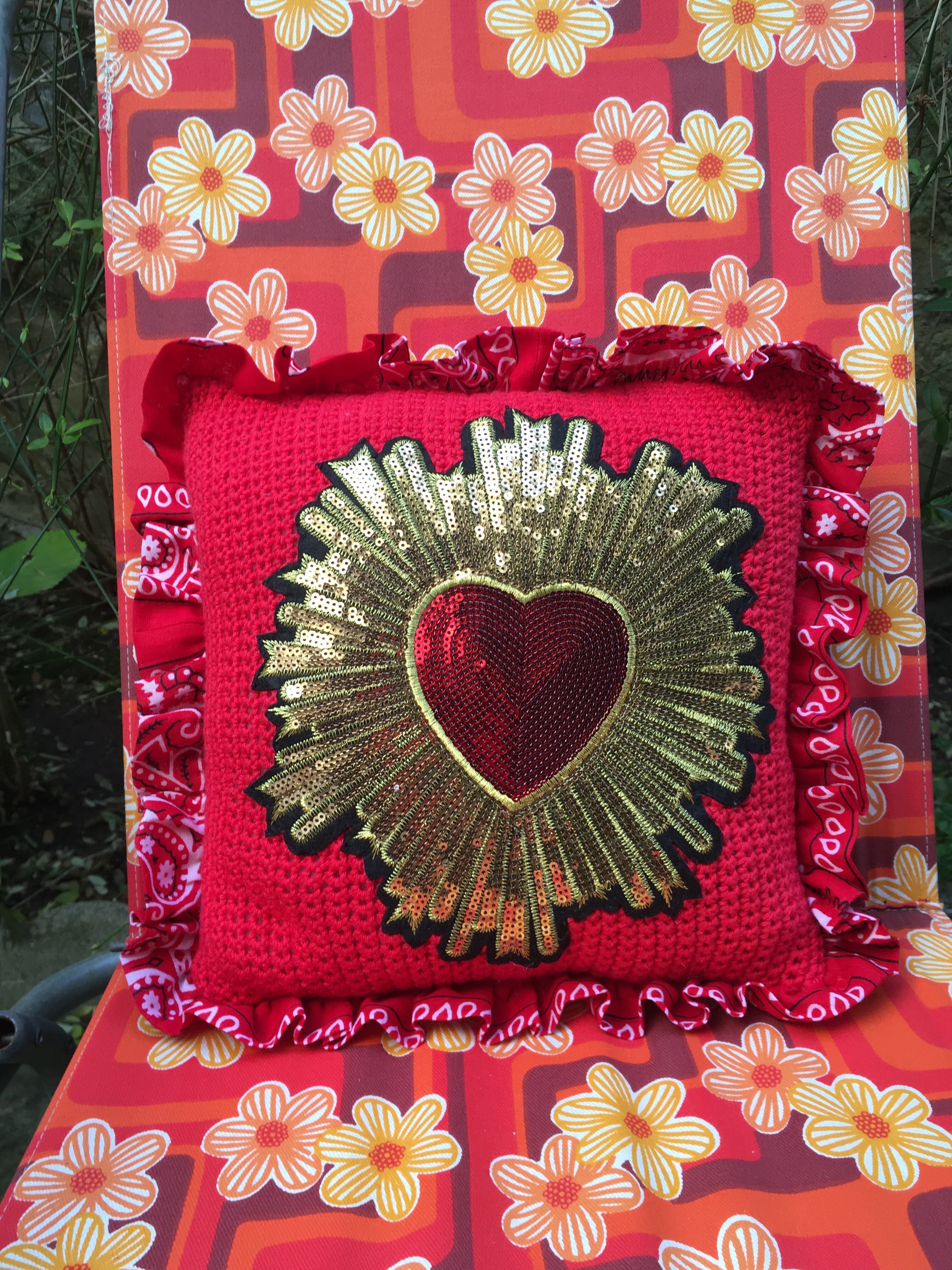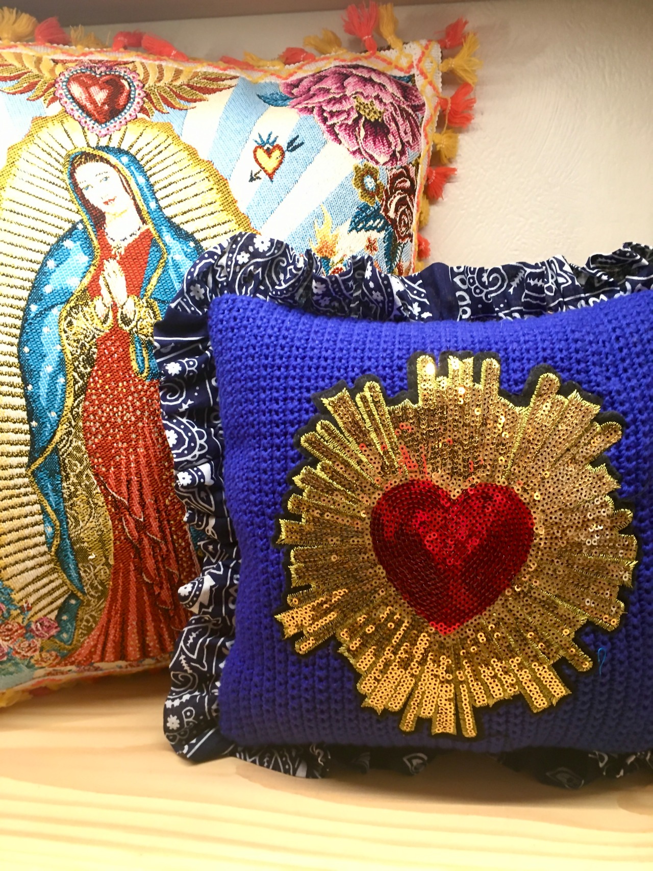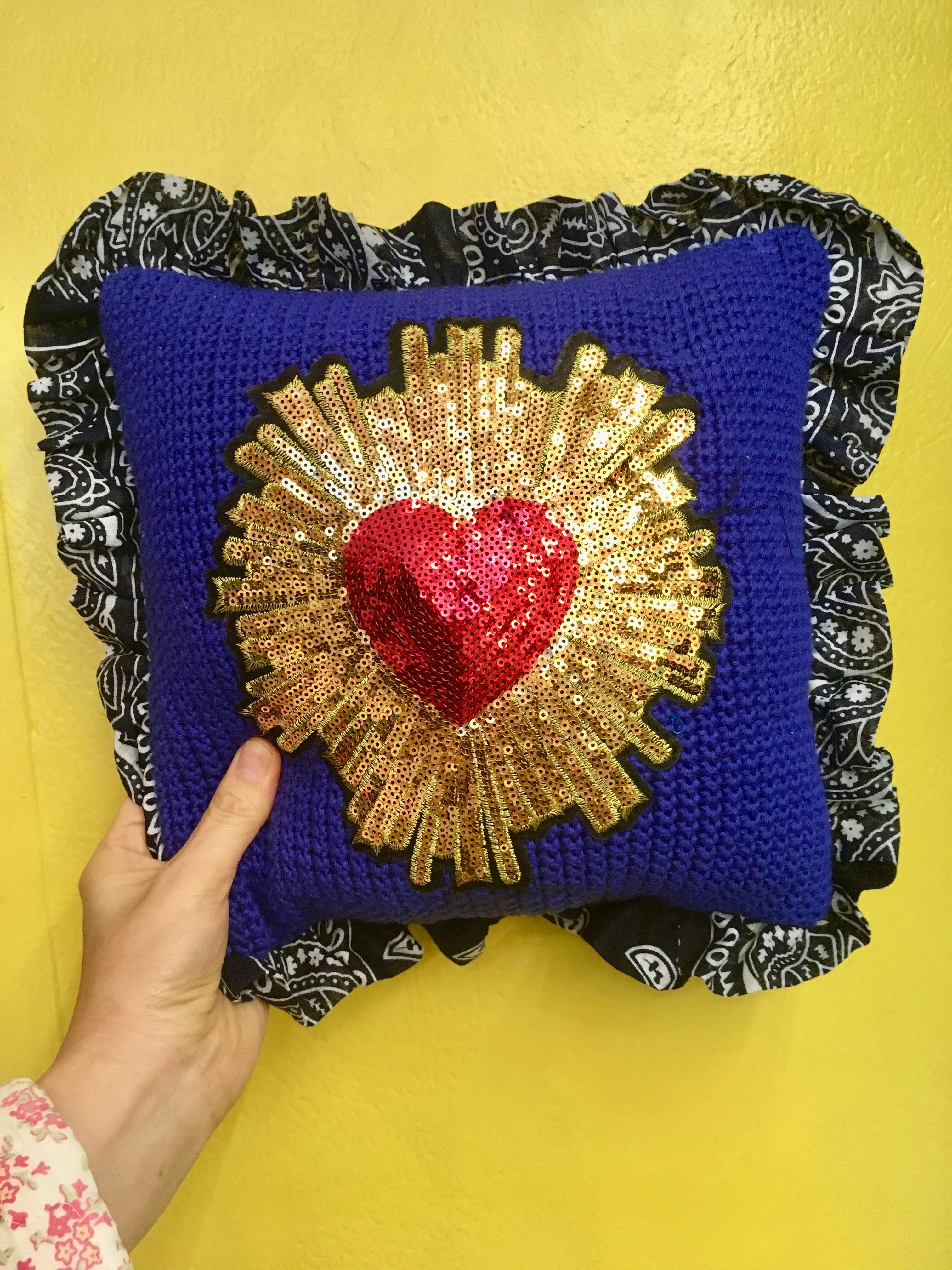 ex-voto モチーフ バンダナ生地 赤/ネイビーブルー 鍵編みミニクッション フランス製 一点もの collab Zoïzoï