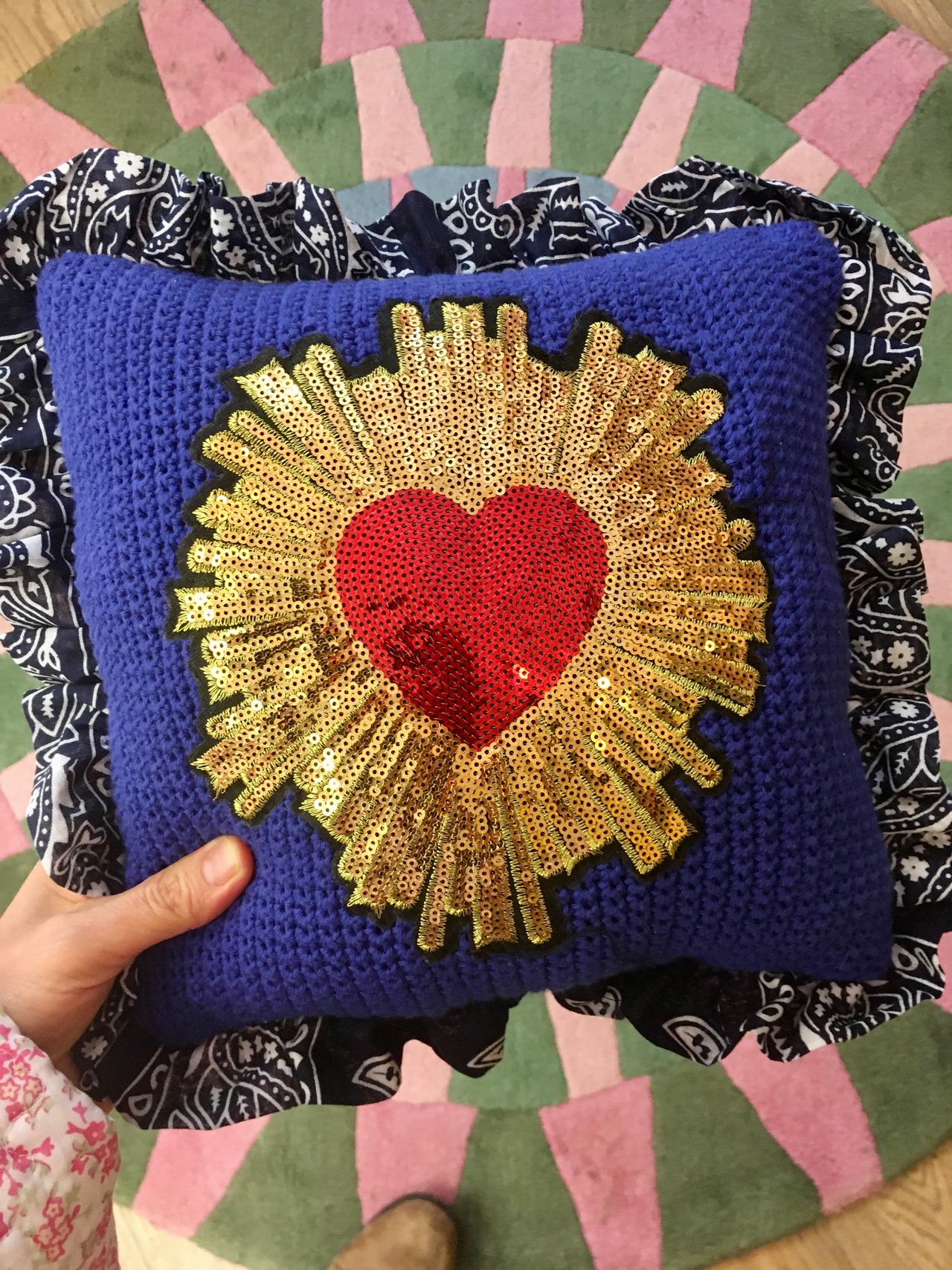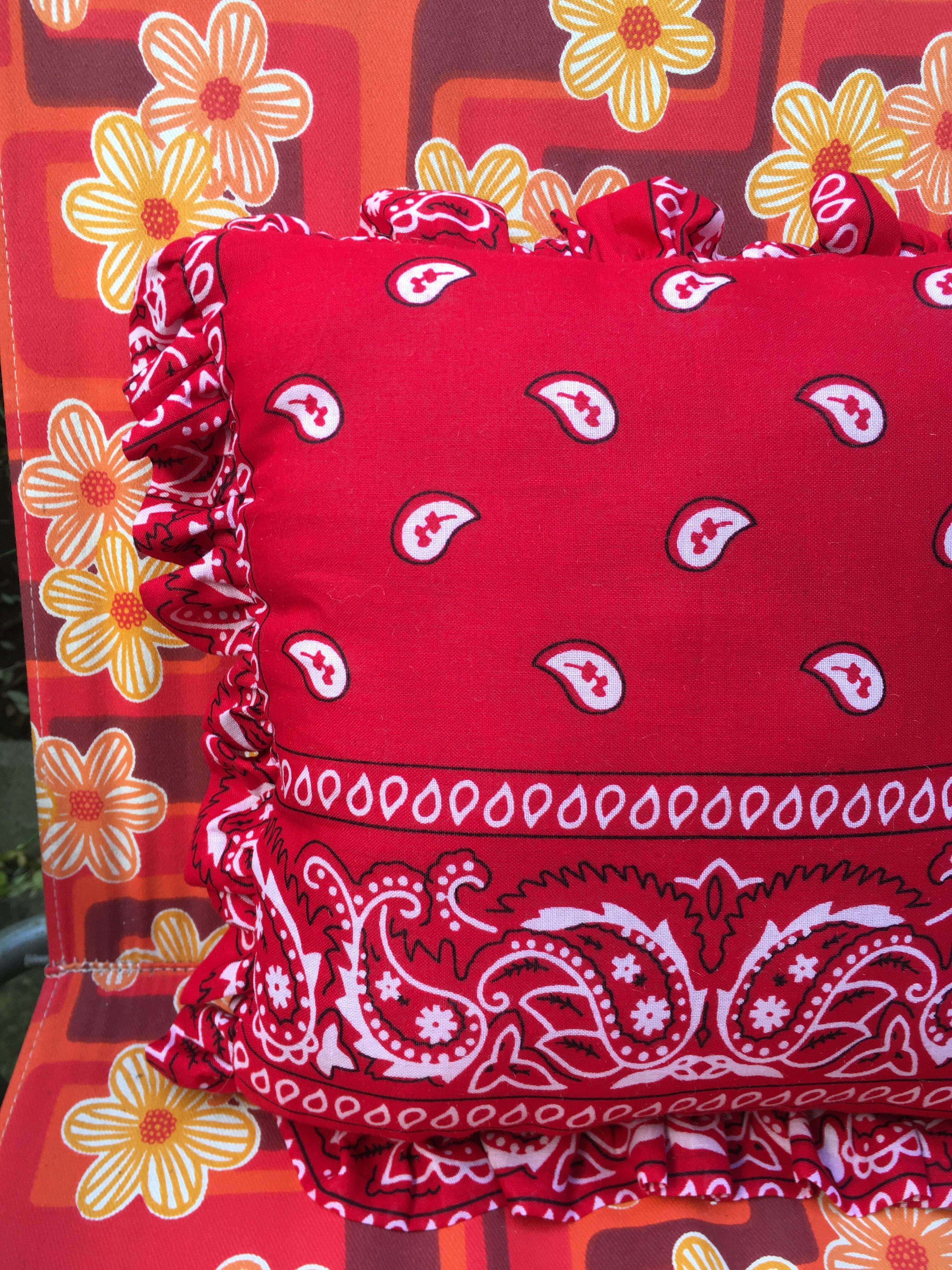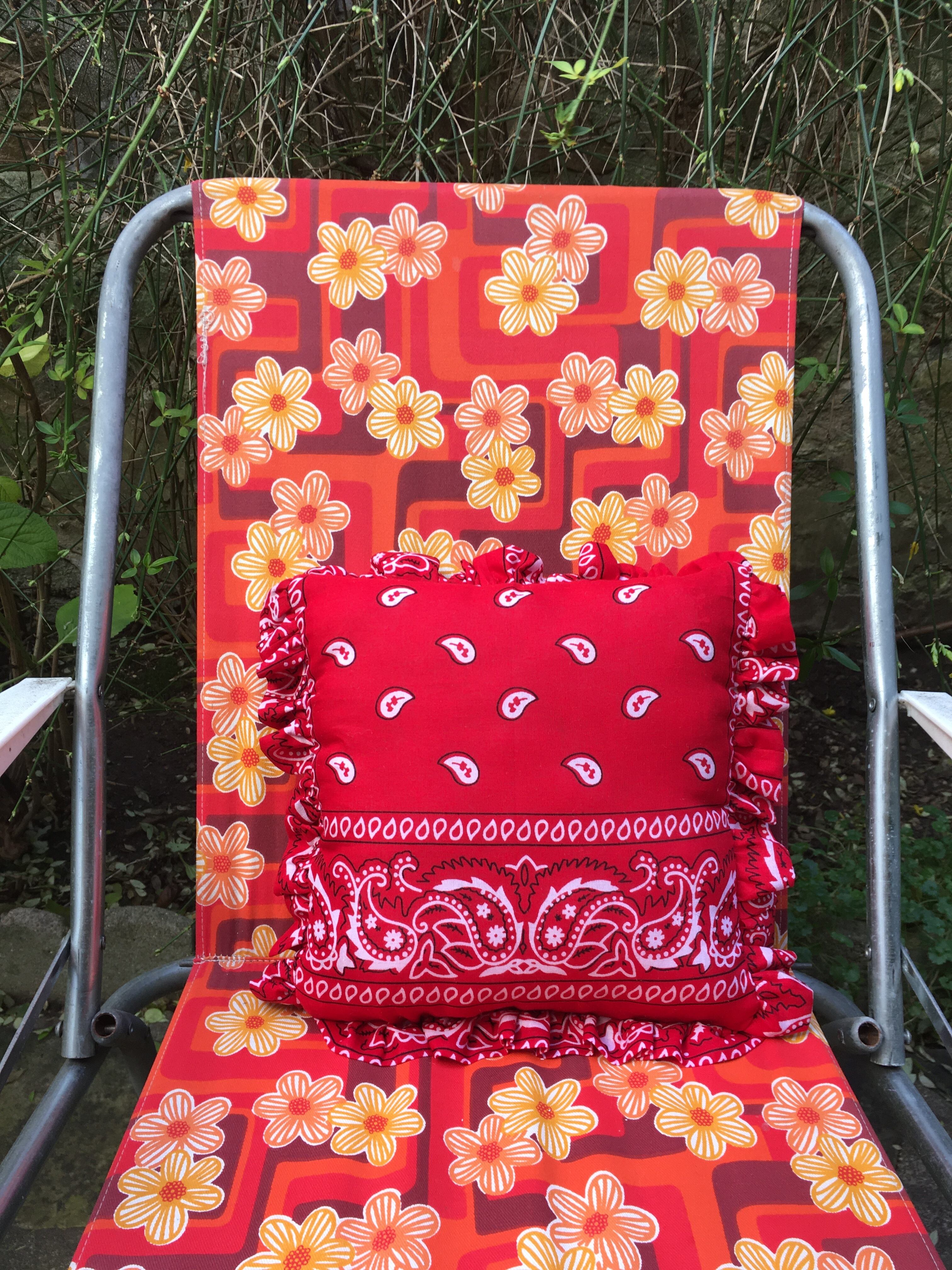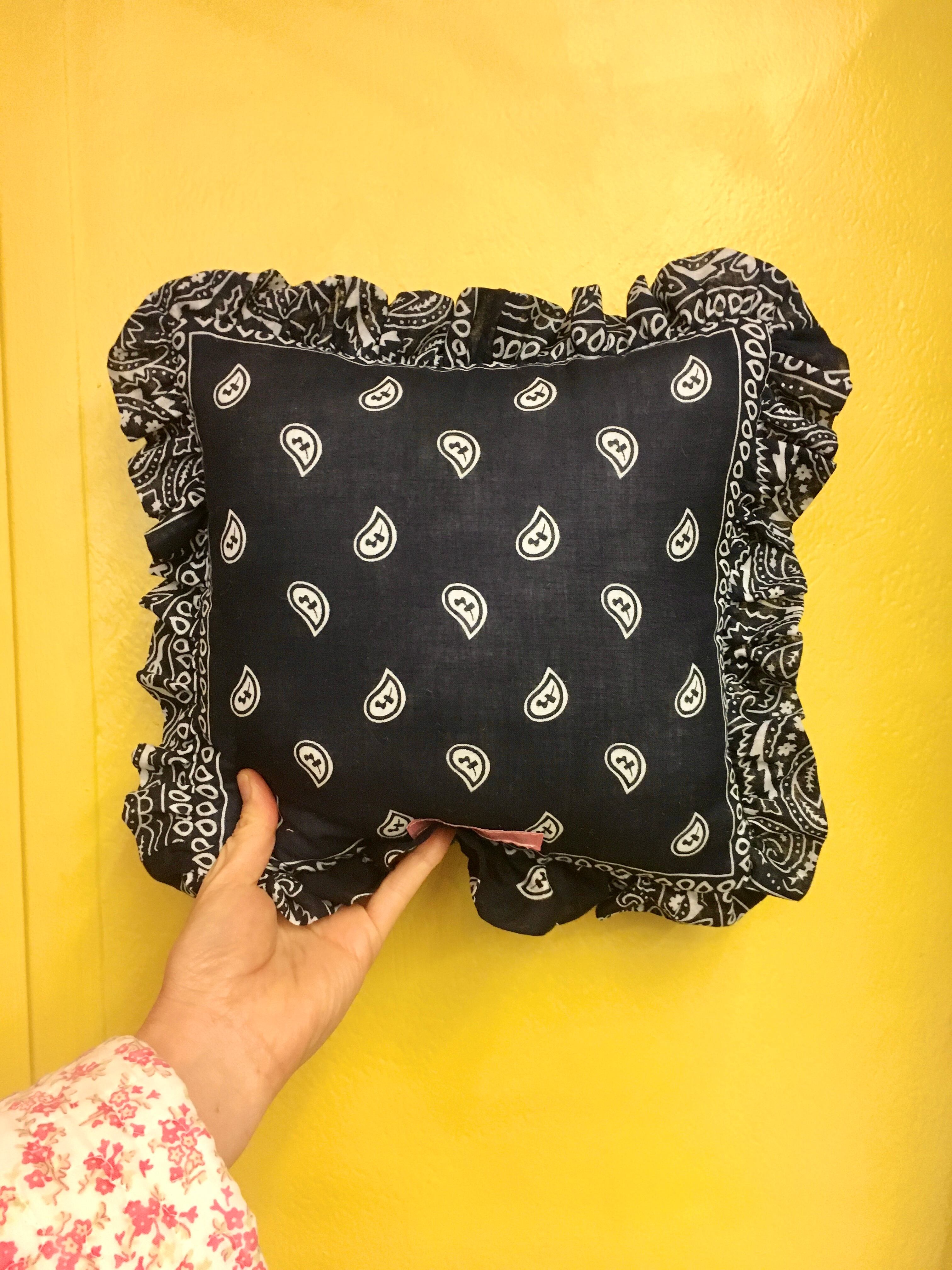 ex-voto モチーフ バンダナ生地 赤/ネイビーブルー 鍵編みミニクッション フランス製 一点もの collab Zoïzoï