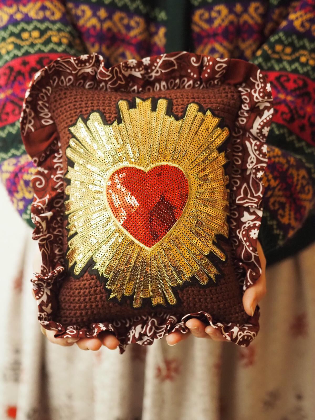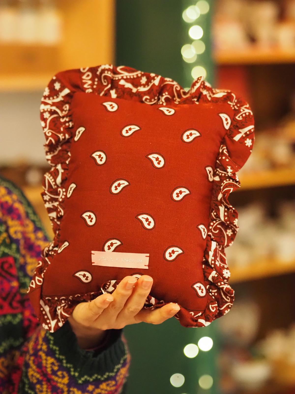 .あたたかいボルドー色のバンダナ生地は、心を和ませる落ち着いた雰囲気を演出し、インテリアに華やかさを添えます。ex-votoのモチーフは、お部屋に上品さと個性を与えます。